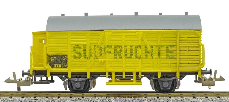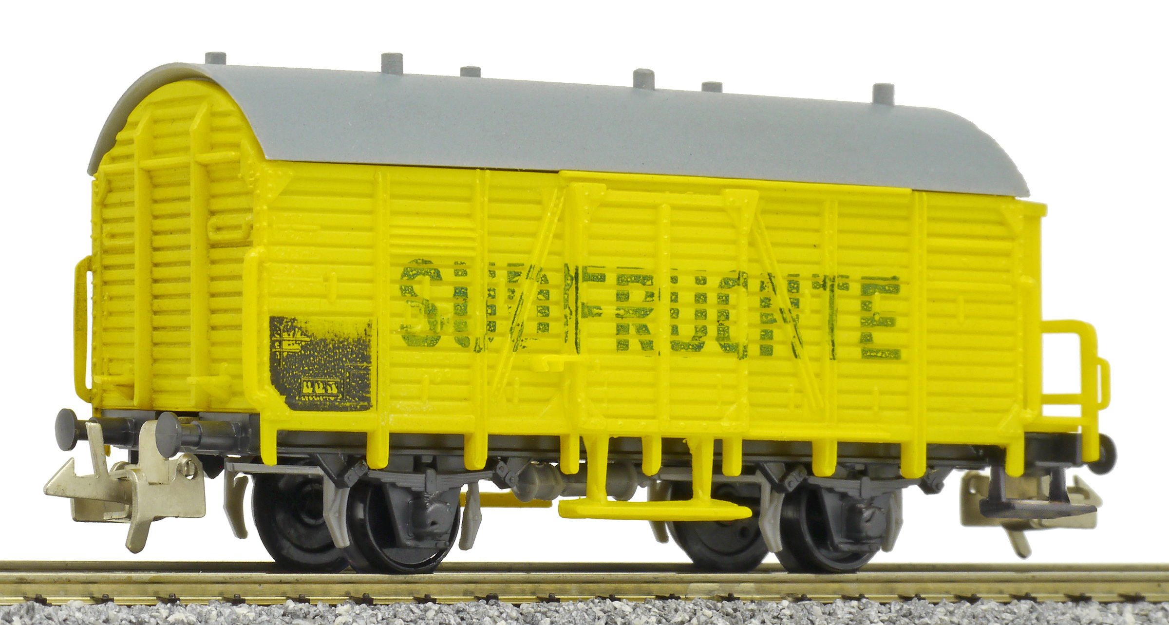 | nákladní chladící vůz žlutý s šedou střechou a s brzdařskou „Südfrüchte“ |