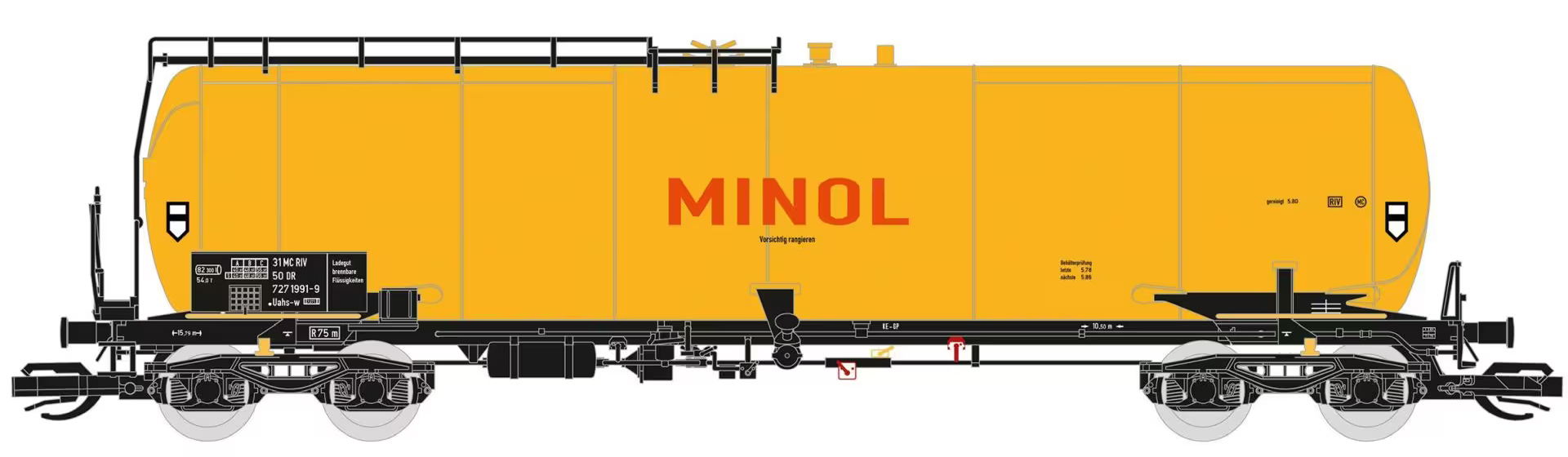| kotlový vůz na lehké oleje žlutý s podélnou lávkou a s brzdařskou plošinou „MINOL“ |