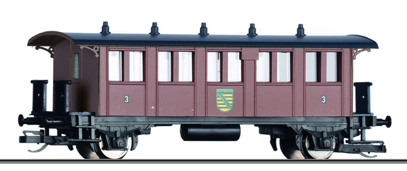 | osobní vůz tmavě červený s černou střechou 3. tř. s logem „Sachsen“ |