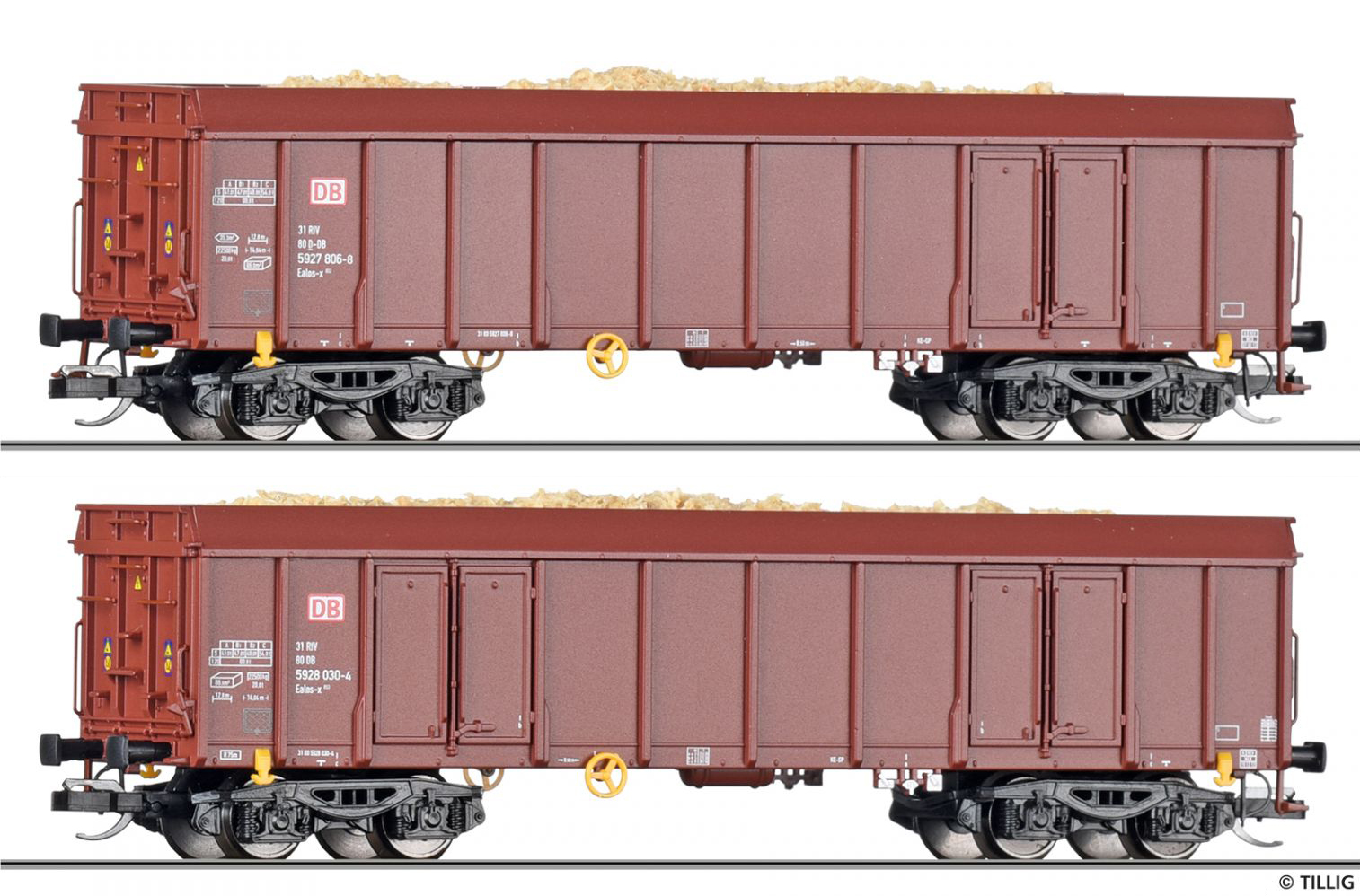 | set dvou vysokostěnných nákladních vozů ložených dřevěnou štěpkou |