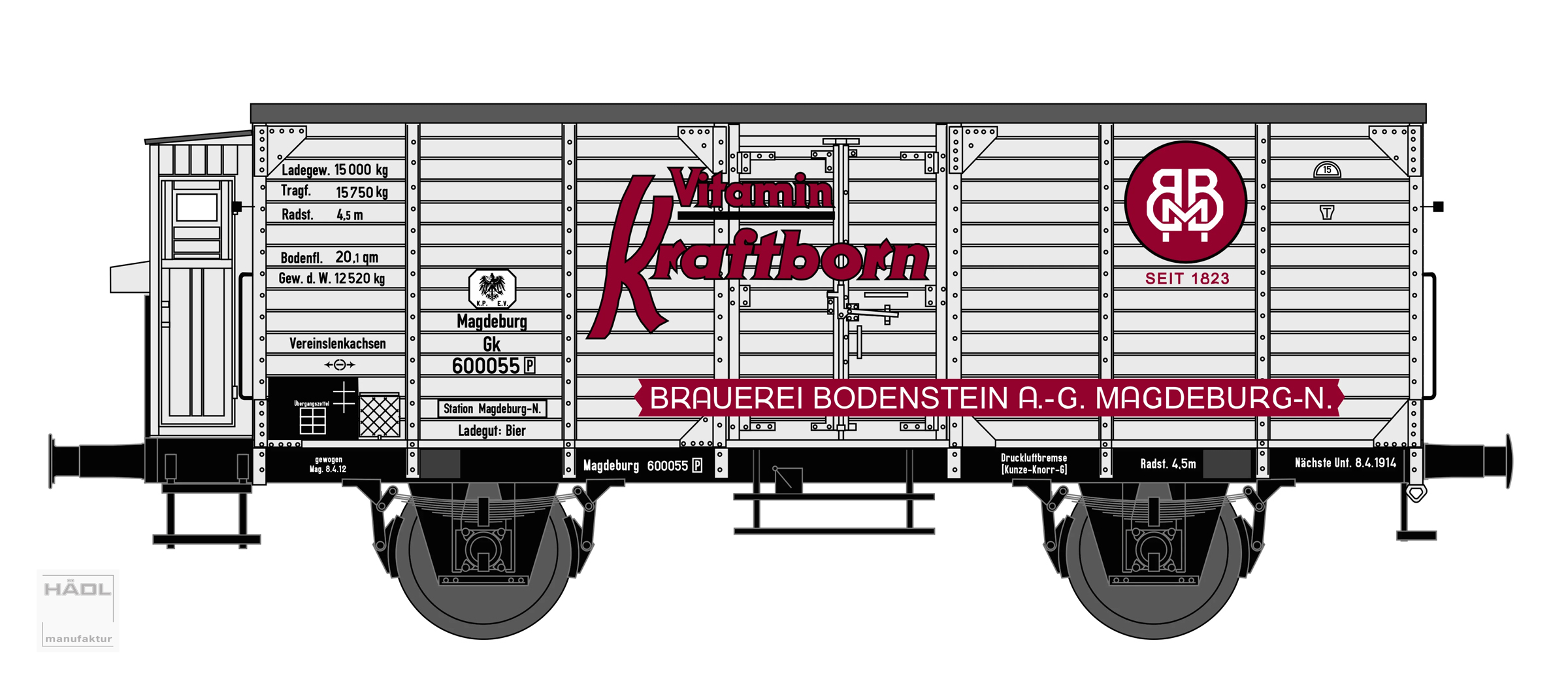 | krytý nákladní vůz bílý s šedou střechou „Vitamin Kraftborn, Brauerei Bodenstein AG Magdeburg“ |