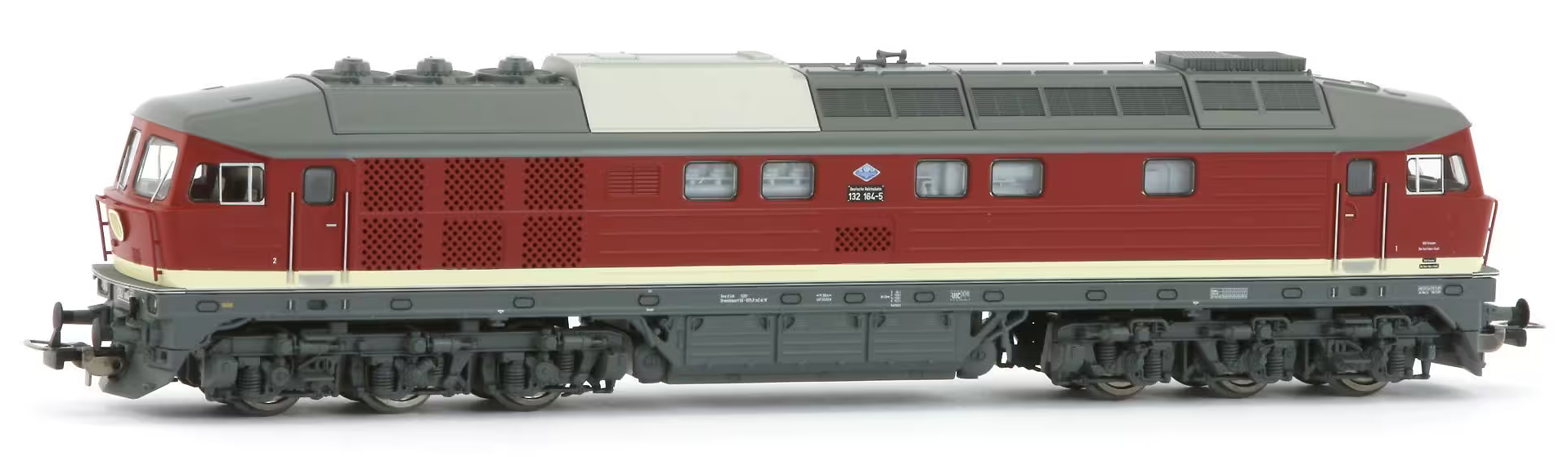 | dieselová lokomotiva rubínově červená s krémovým proužkem, střecha, rám a pojezd čedičově šedý |