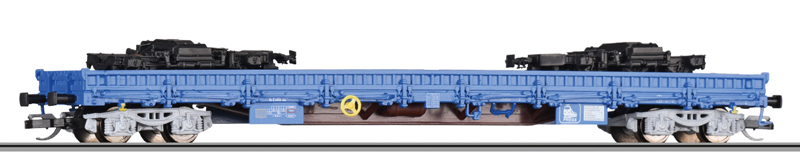 | nízkostěnný nákladní vůz modrý s nákladem dvou lokomotivních podvozků |