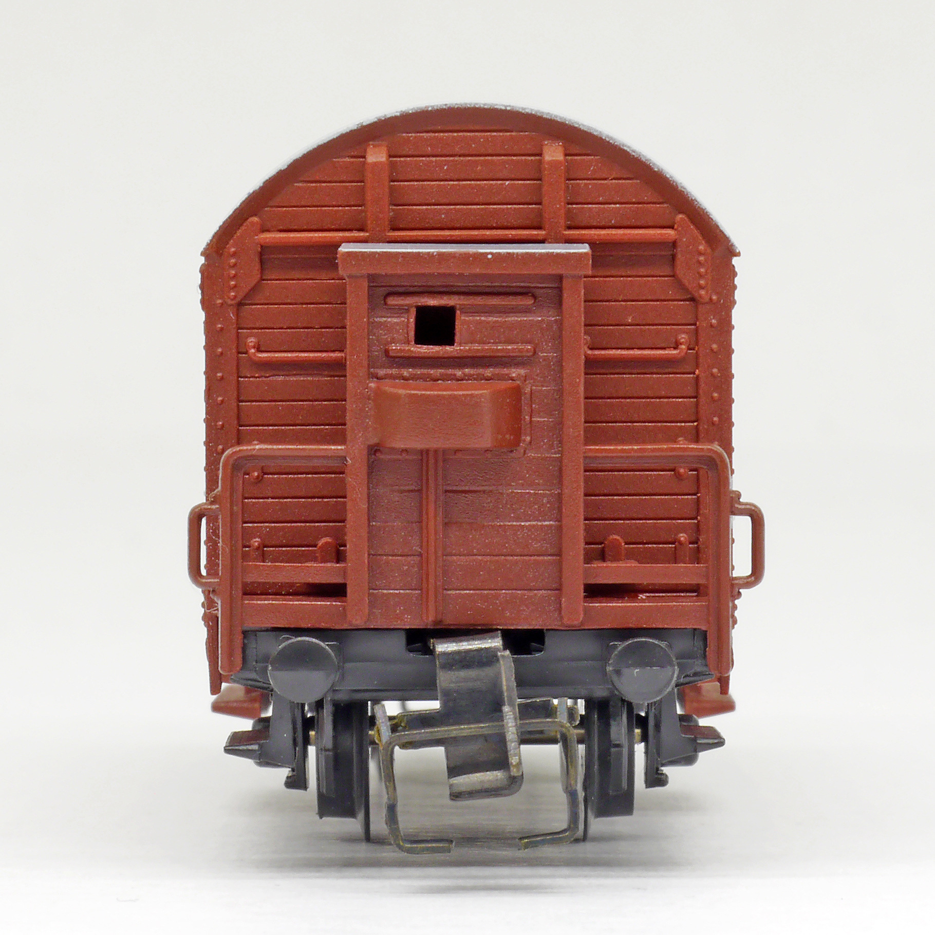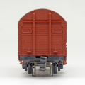| krytý nákladní vůz červenohnědý s černou střechou a s brzdařskou budkou |