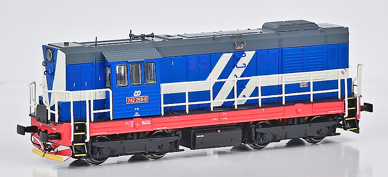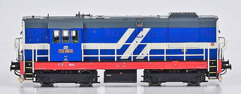 | dieselová lokomotiva modrá-bílá, tmavě šedá střecha, červený rám |