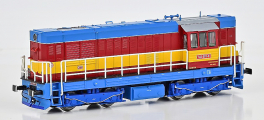 | dieselová lokomotiva červená s výstažným pruhem, světle modrá střecha, rám a pojezdý rám |