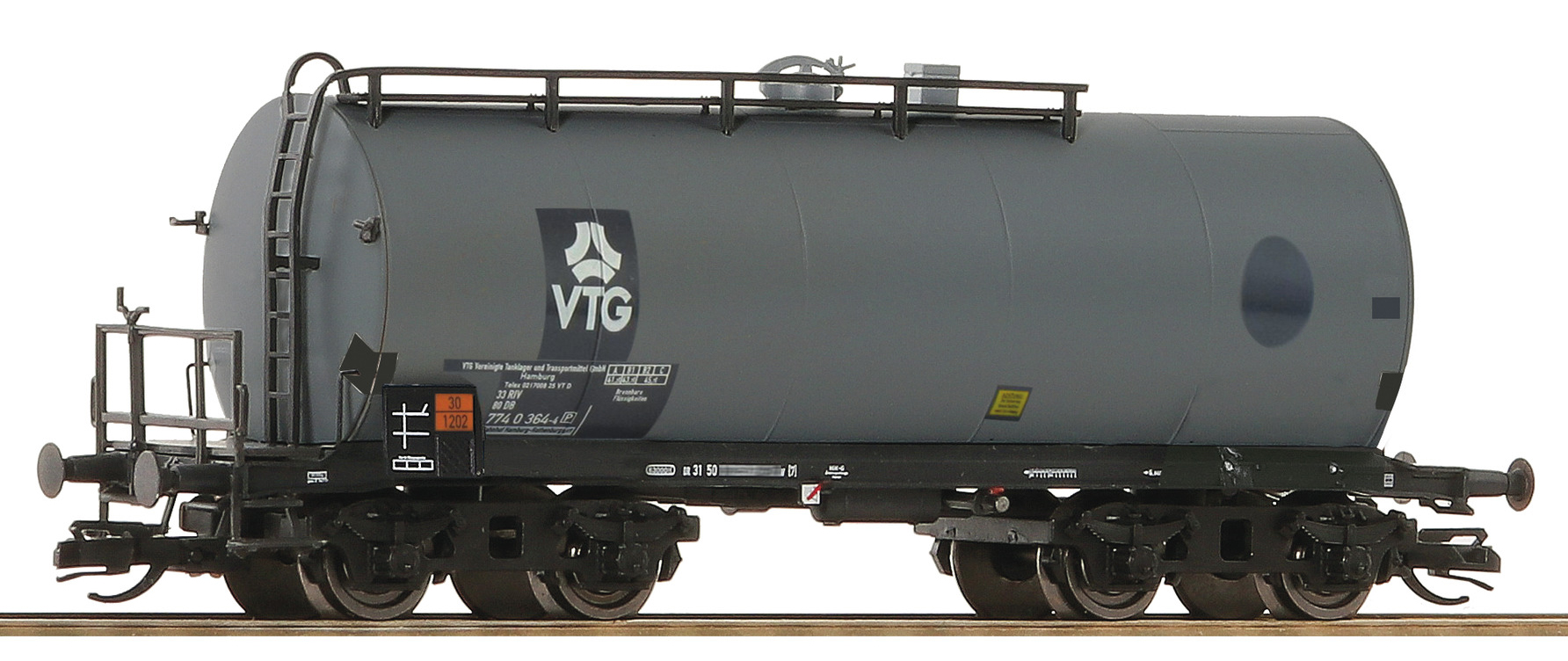 | set dvou kotlových vozů s podélnou lávkou a s logem „VTG“ |