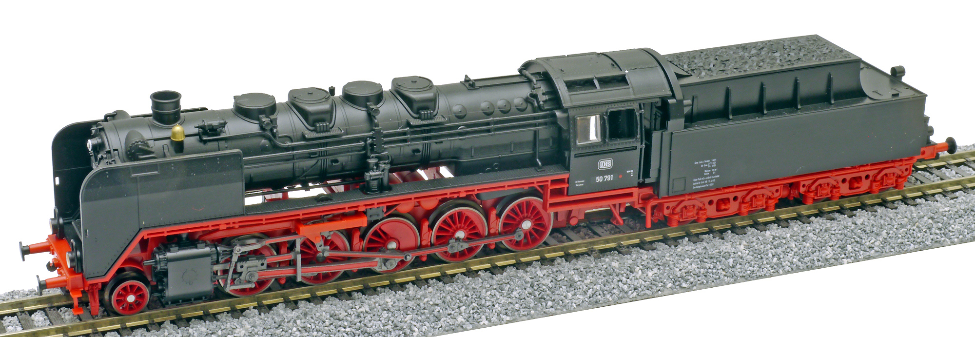 Kód   125002  [Lokomotivy] → [Parní] → [BR 50] → 125002: černá s červeným pojezdem a kouřovými plechy, tendr nové konstrukce