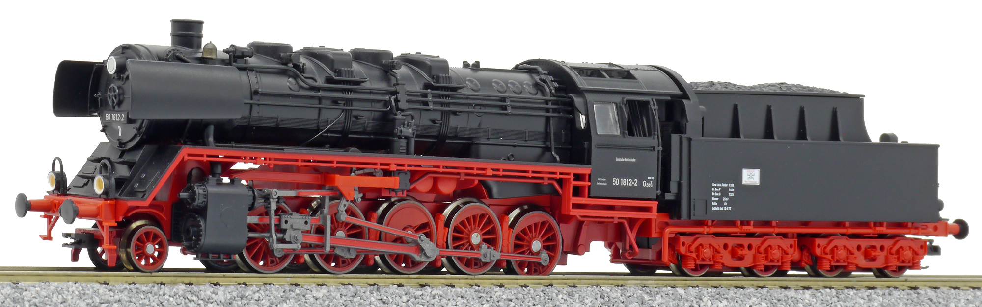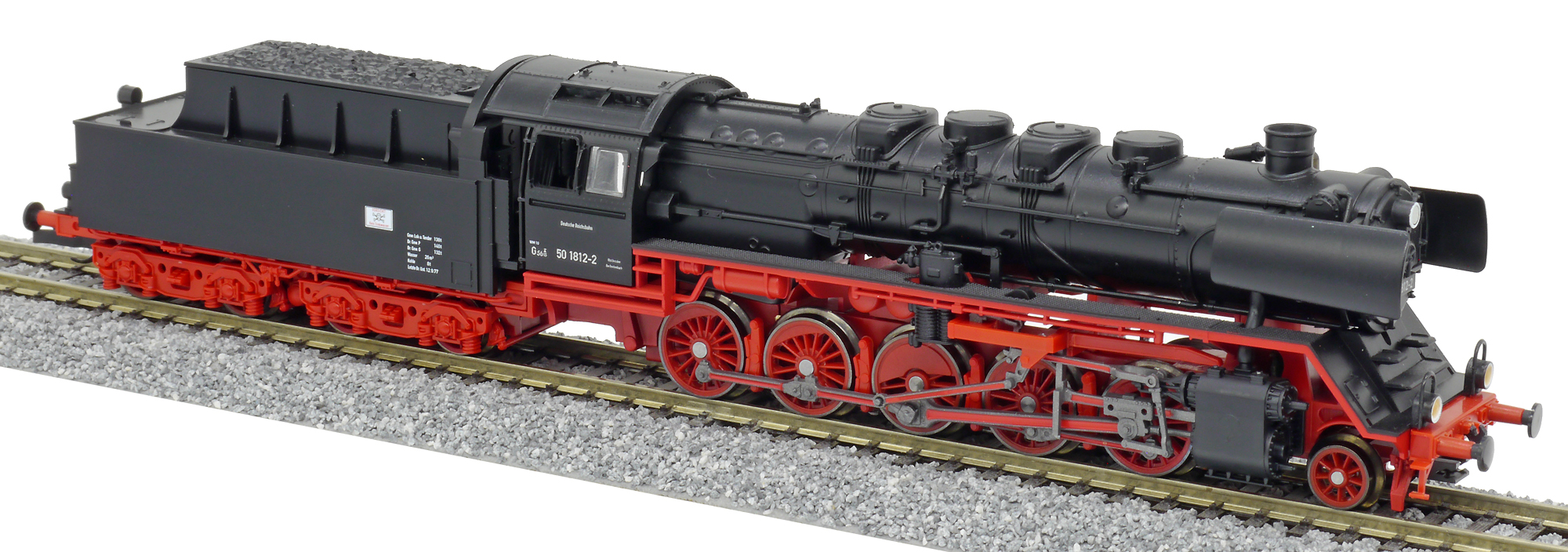 Kód   125002  [Lokomotivy] → [Parní] → [BR 50] → 125002: černá s červeným pojezdem a kouřovými plechy, tendr nové konstrukce