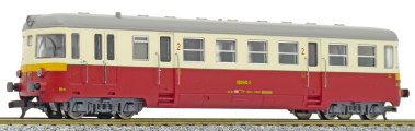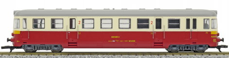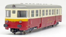 Popis   motorový vůz červený-slonová kost s šedou střechou, výstražný pruh na čelech
