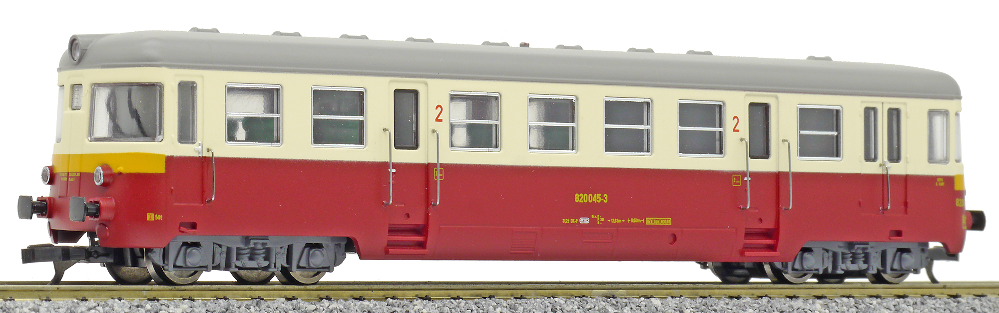 Kód   CSD-820-009  [Lokomotivy] → [Motorové vozy a jednotky] → [M240.0 (820)] → CSD-820-009: motorový vůz červený s výstražným pruhem a s šedou střechou