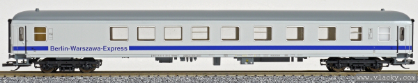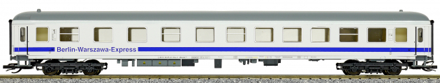 | rychlíkový vůz bílý s modrým pásem a šedou střechou bordbistro „Berlin-Warszawa-Express“ |
