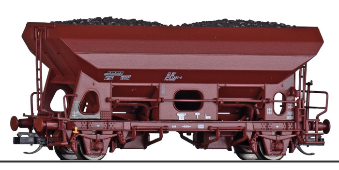 | samovýsypný vůz červenohnědý s nákladem uhlí |
