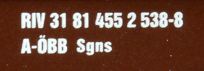 | • 31 81 455 2 538-8 | → | nákladní, s podvozky, pevný rozchod, ve vlastnictví železniční správy, RIV, PPV |
