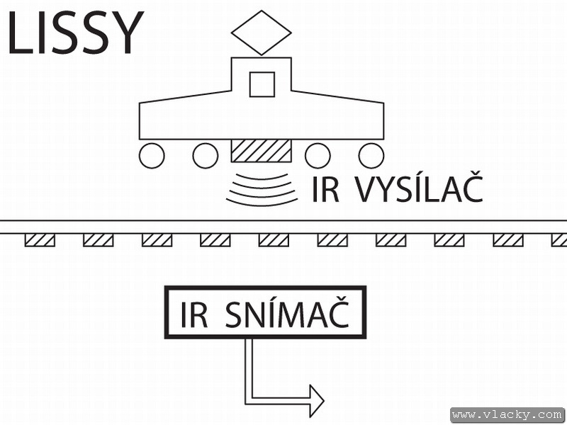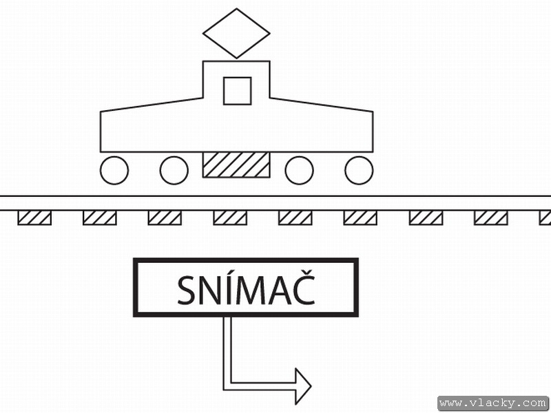 infra vysílače a přijímače mezi kolejnice. Vysílač vyzařuje nahoru a přijíždějící lokomotiva (vlak) odrazí paprsek do přijímače, který je namontován poblíž.