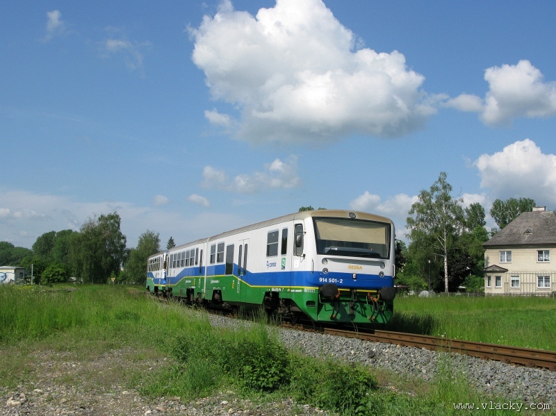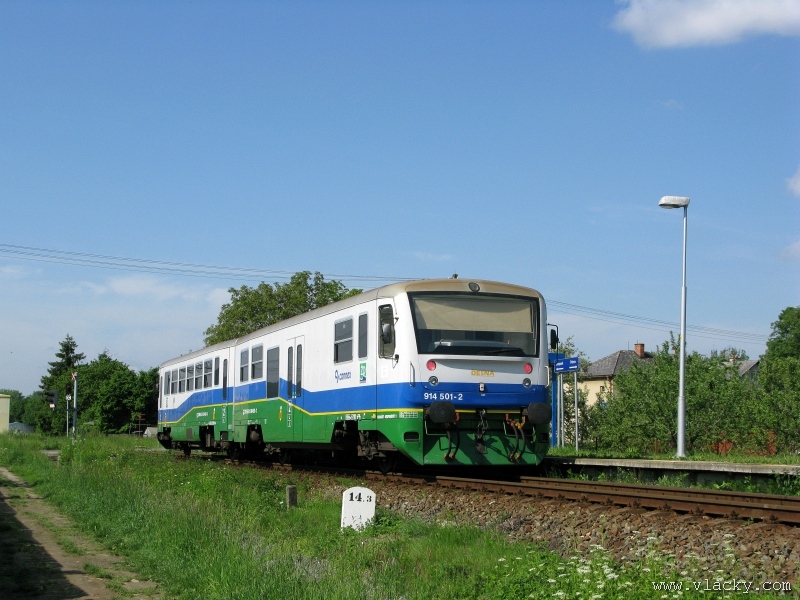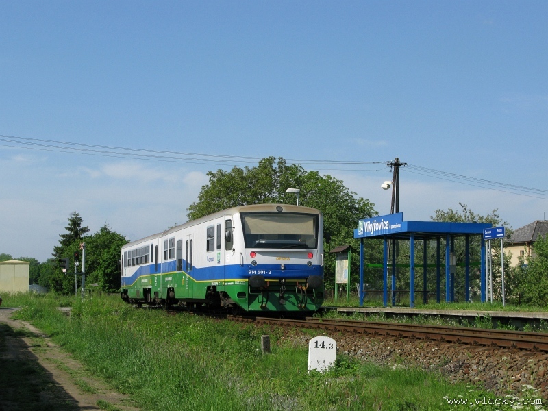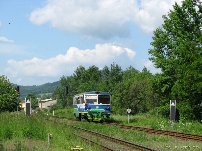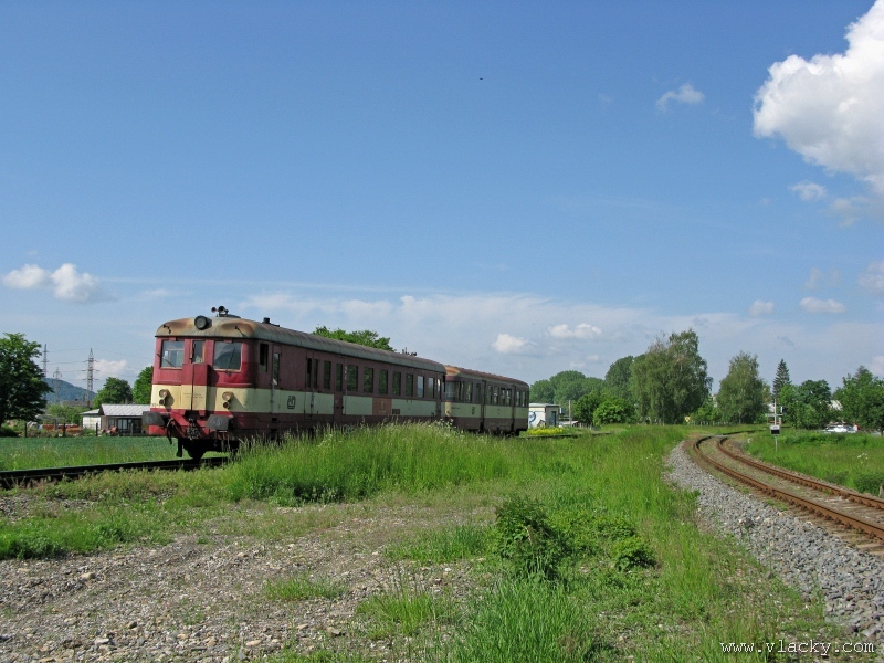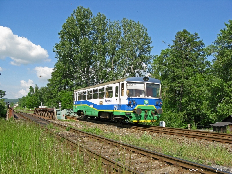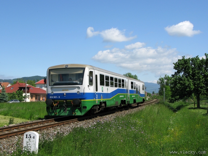 Díky slunečnému počasí jsem vyrazil k trati opět na kole. Nejdříve jsem přijel k zastávce Vikýřovice u penzionu. Do Šumperka se zrovna vracel Os 13761 v 9.28. Směrem k Šumperku se po levé straně přimyká trať 290 Olomouc - Šumperk. Zrovna jsem na trati zastihl pravidelný Os 3636 Šumperk - Uničov. Motorové vozy řady 831 jsou stále v provozu na této trati a na trati 292 Šumperk - Krnov. Řeku Desnou překonává každá z obou tratí po vlastním mostě. Na trati 290 je původní most, ale most na trati 293 Železnice Desná byl poškozen při povodni v roce 1997. Krátce po povodni byla trať Železnice Desná dočasně napojena výhybkou na trať 290. Zde jsem také zachytil průjezd pravidelného Os 23857 ve směru do Šumperka v 10.19, který se za chvíli vracel zpět jako Os 13762 v 10.30. Pokračoval jsem na své cestě nedaleko před zastávku Vikýřovice. Zrovna projížděl Os 13763 z Koutů nad Desnou do Šumperka v 11.07. Stačil jsem dojít až na zastávku a jel další Os 13765 ze Sobotína do Šumperka, který v 11.24 zastávku Vikýřovice projížděl. O kilometr dále je zastávka Vikýřovice-Lesní. Je to jedna z nejmladších zastávek na trati a nachází se až na okraji zástavby. Dále za touto zastávkou prochází trať cca 2km mezi poli až do Petrova nad Desnou. V dáli jsem už viděl přijíždět od Šumperka Os 23858. Přední vůz soupravy pokračuje dále do Koutů nad Desnou jako Os 13764, zadní vůz soupravy, jednotka "Desná", jede do Sobotína. Směrem ke stanici Petrov nad Desnou lze pokračovat podél trati nejdříve po panelové, později po obyčejné polní cestě. Bylo pravé poledne, nikde žádný stín. Ze Sobotína se vracel zpět do Šumperka Os 23859 v 12.10. Potom jsme ještě rozložil stativ na polní cestě a pořídil sadu fotografií, které jsem později spojil do jedné panoramatické. Zleva je výhled přes pole na Vikýřovice, uprostřed za cestou začíná Petrov nad Desnou, v popředí dominuje velké budova základní školy, za ní vlevo je dobře vidět kostel Nanebevzetí Panny Marie v Rapotíně. Uprostřed panoramatu dominuje protilehlý Bukový kopec s výškou 641m. Zcela vpravo na okraji vesnice Petrova nad Desnou je v dáli vidět stanice Petrov nad Desnou a vzadu na horizontu pohoří Hrubý Jeseník. Záverem bych ještě upozornil na kilometrovníky (hektometrovníky) u trati. Původně postavená trať vedla ze Zábřehu na Moravě do Sobotína. Teprve vývojem další doby ztratila trať na významu, hlavní tratí Železnice Desná se stal úsek Šumperk - Kouty nad Desnou a z tříkilometrové úseku Petrov nad Desnou - Sobotín se stala odbočná trať. Původní kilometrické očíslování trati však zůstalo zachováno.