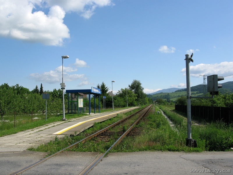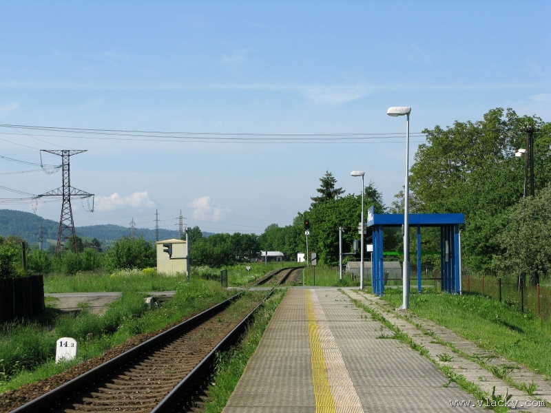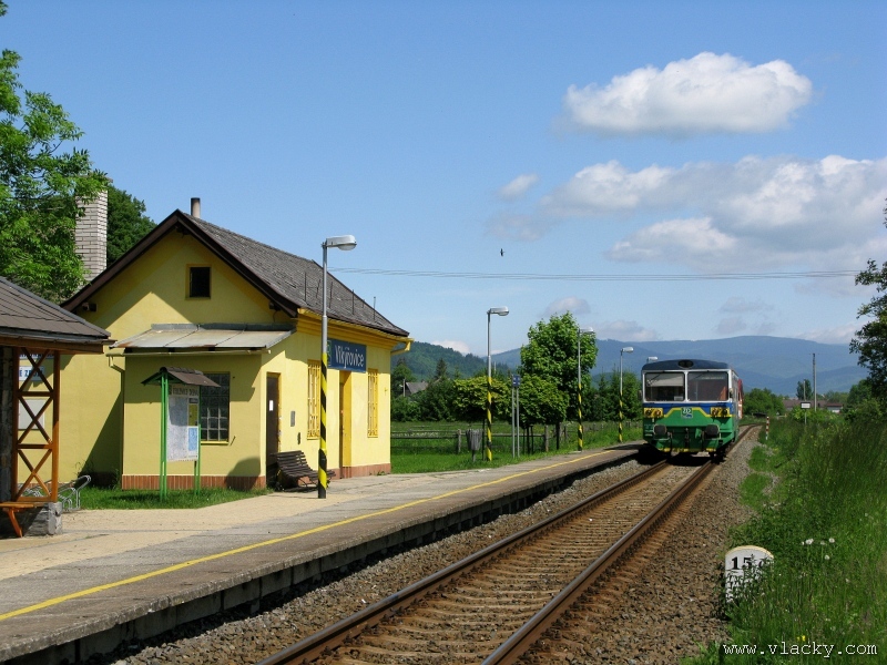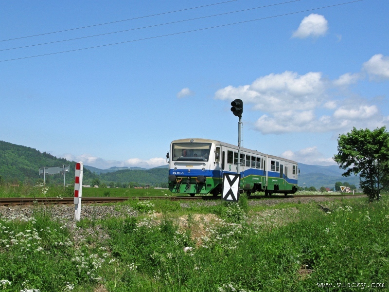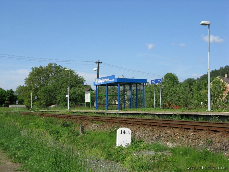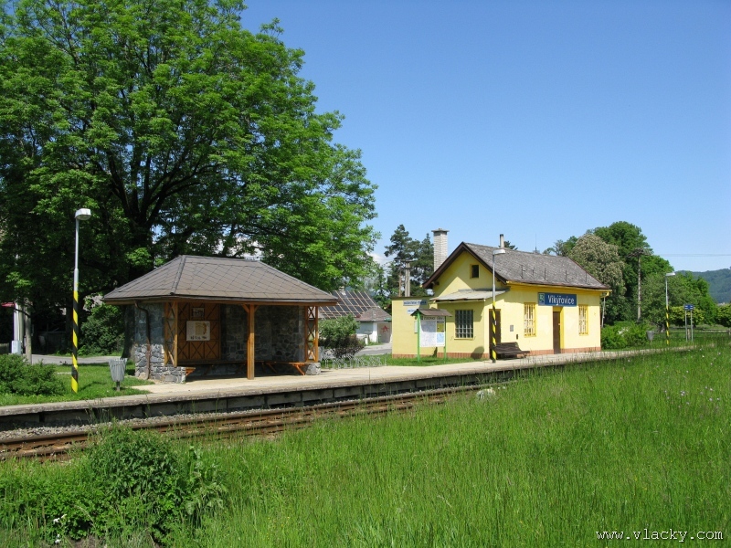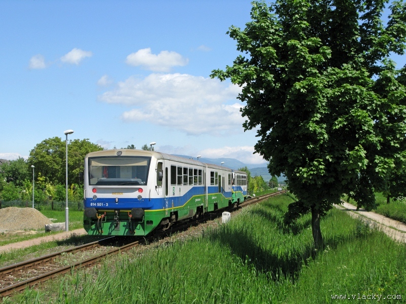 Díky slunečnému počasí jsem vyrazil k trati opět na kole. Nejdříve jsem přijel k zastávce Vikýřovice u penzionu. Do Šumperka se zrovna vracel Os 13761 v 9.28. Směrem k Šumperku se po levé straně přimyká trať 290 Olomouc - Šumperk. Zrovna jsem na trati zastihl pravidelný Os 3636 Šumperk - Uničov. Motorové vozy řady 831 jsou stále v provozu na této trati a na trati 292 Šumperk - Krnov. Řeku Desnou překonává každá z obou tratí po vlastním mostě. Na trati 290 je původní most, ale most na trati 293 Železnice Desná byl poškozen při povodni v roce 1997. Krátce po povodni byla trať Železnice Desná dočasně napojena výhybkou na trať 290. Zde jsem také zachytil průjezd pravidelného Os 23857 ve směru do Šumperka v 10.19, který se za chvíli vracel zpět jako Os 13762 v 10.30. Pokračoval jsem na své cestě nedaleko před zastávku Vikýřovice. Zrovna projížděl Os 13763 z Koutů nad Desnou do Šumperka v 11.07. Stačil jsem dojít až na zastávku a jel další Os 13765 ze Sobotína do Šumperka, který v 11.24 zastávku Vikýřovice projížděl. O kilometr dále je zastávka Vikýřovice-Lesní. Je to jedna z nejmladších zastávek na trati a nachází se až na okraji zástavby. Dále za touto zastávkou prochází trať cca 2km mezi poli až do Petrova nad Desnou. V dáli jsem už viděl přijíždět od Šumperka Os 23858. Přední vůz soupravy pokračuje dále do Koutů nad Desnou jako Os 13764, zadní vůz soupravy, jednotka "Desná", jede do Sobotína. Směrem ke stanici Petrov nad Desnou lze pokračovat podél trati nejdříve po panelové, později po obyčejné polní cestě. Bylo pravé poledne, nikde žádný stín. Ze Sobotína se vracel zpět do Šumperka Os 23859 v 12.10. Potom jsme ještě rozložil stativ na polní cestě a pořídil sadu fotografií, které jsem později spojil do jedné panoramatické. Zleva je výhled přes pole na Vikýřovice, uprostřed za cestou začíná Petrov nad Desnou, v popředí dominuje velké budova základní školy, za ní vlevo je dobře vidět kostel Nanebevzetí Panny Marie v Rapotíně. Uprostřed panoramatu dominuje protilehlý Bukový kopec s výškou 641m. Zcela vpravo na okraji vesnice Petrova nad Desnou je v dáli vidět stanice Petrov nad Desnou a vzadu na horizontu pohoří Hrubý Jeseník. Záverem bych ještě upozornil na kilometrovníky (hektometrovníky) u trati. Původně postavená trať vedla ze Zábřehu na Moravě do Sobotína. Teprve vývojem další doby ztratila trať na významu, hlavní tratí Železnice Desná se stal úsek Šumperk - Kouty nad Desnou a z tříkilometrové úseku Petrov nad Desnou - Sobotín se stala odbočná trať. Původní kilometrické očíslování trati však zůstalo zachováno.